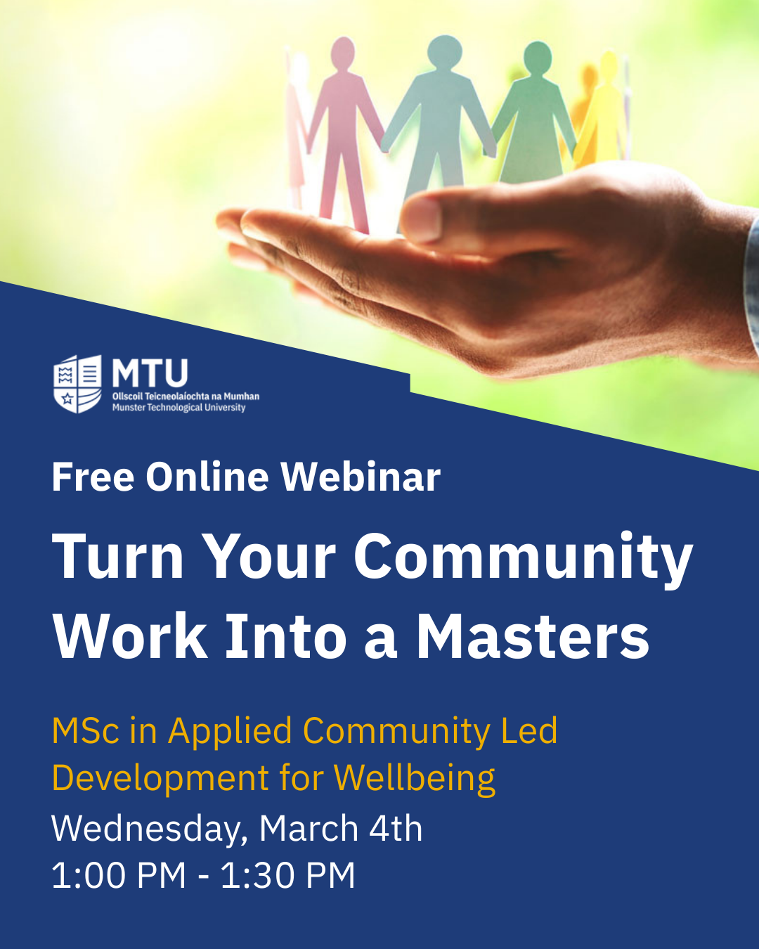Join our free 30-minute lunchtime webinar to learn about MTU Kerry Campus's new MSc in Applied Community-Led Development for Wellbeing, a part-time, hybrid programme, starting in September 2026, that fits around your work.